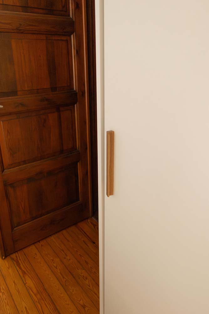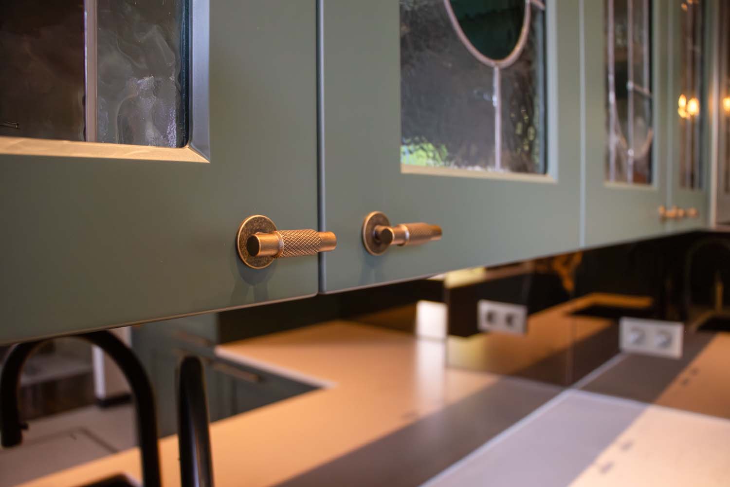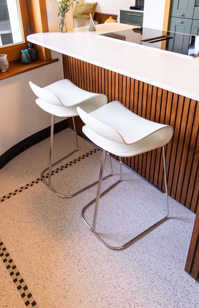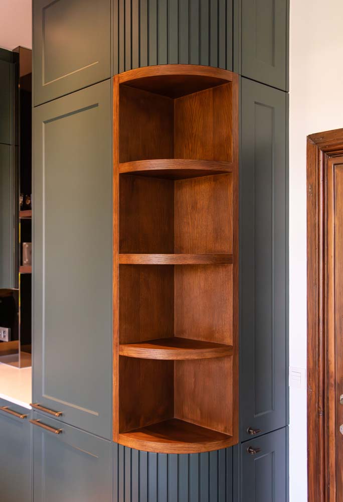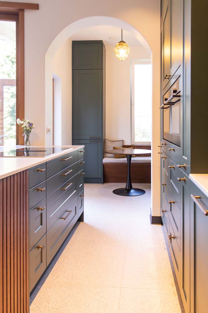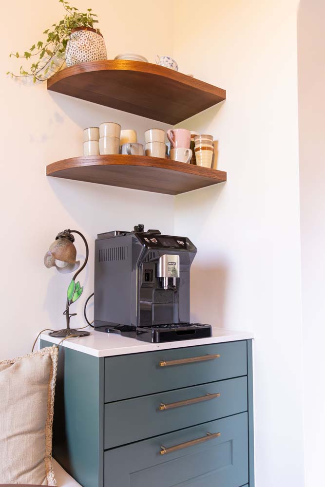 - De keuken, het centrale element van de woning met gebogen vormen en een koffiehoekje. De fronten hebben een kader en zijn gelakt in een groene kleur (Häcker), gecombineerd met maatwerk van eik in dezelfde kleur als het bestaande parket. De details voerden we uit in messing-kleur en voor het werkblad kozen we een steen in Silestone Lime Delight van Culot. De toestellen zijn van het merk Pelgrim.